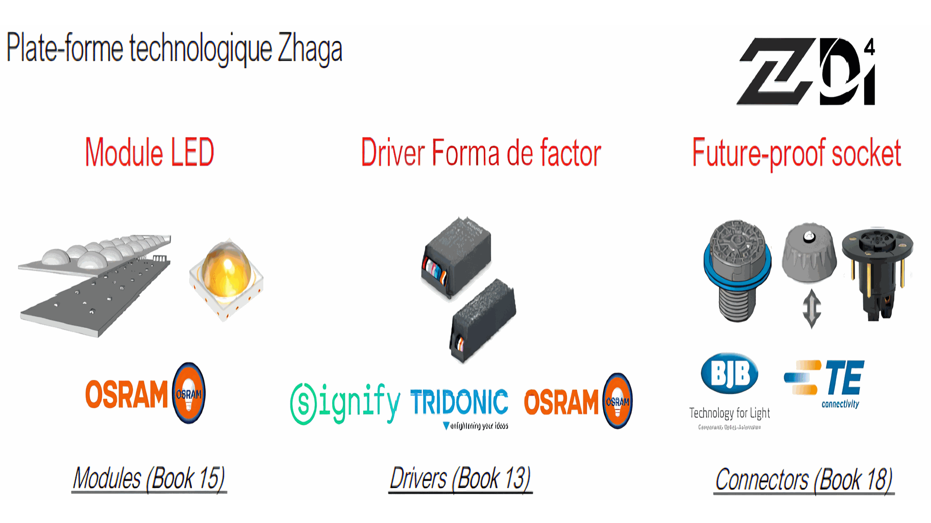 Le standard Zhaga-D4i (Book 13, 15, 18) garantit des luminaires compatibles avec des drivers intelligents, des modules LED interchangeables et des systèmes de connectivité.